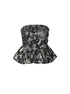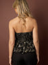 Deze top is een strapless corset-achtige bustier met een elegante, vrouwelijke uitstraling. De stof heeft een zwarte basis met een fijn, glanzend bloemenmotief dat een luxe en romantisch effect geeft. Het model is getailleerd aan de bovenkant en loopt onderaan uit in een speelse peplumzoom, waardoor het silhouet extra geaccentueerd wordt. De combinatie van het strakke bovenlijfje en de uitlopende onderkant zorgt voor een chique, flatterende look — ideaal voor een avondje uit of een speciale gelegenheid.