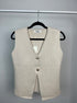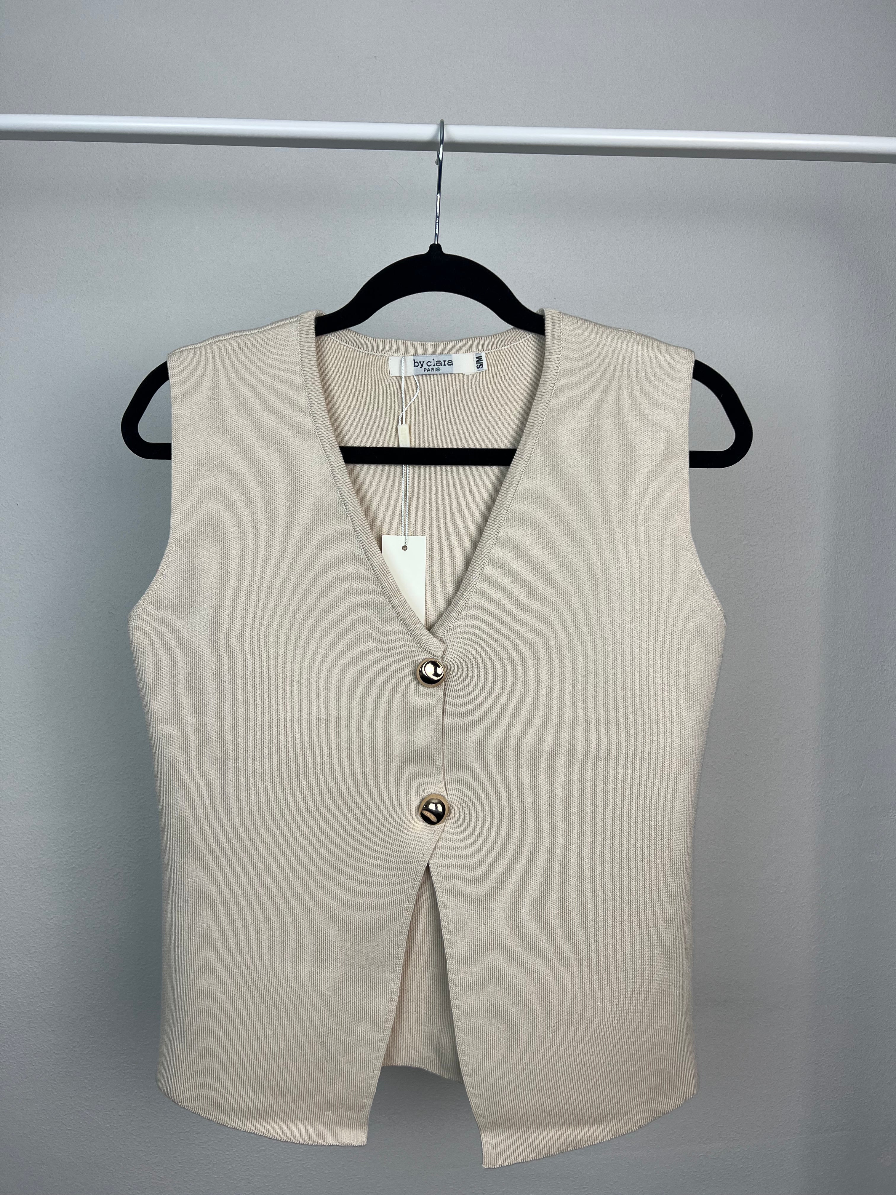 De Isabel Top is een beige, mouwloze top met twee opvallende gouden knopen die een luxe uitstraling geven. Combineer ‘m moeiteloos met je favoriete jeans of een pantalon voor een elegante en chique look.