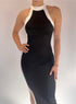 De Kendal Dress omhult je silhouet met een strakke pasvorm en halterneck die jouw nek en schouders extra accentueert. De split aan de onderkant voegt een speels en verleidelijk detail toe, terwijl de elegante witte streep langs de zijkant zorgt voor een stijlvolle twist. Ideaal voor een avondje uit, een feestje of wanneer je gewoon wilt stralen.