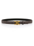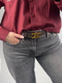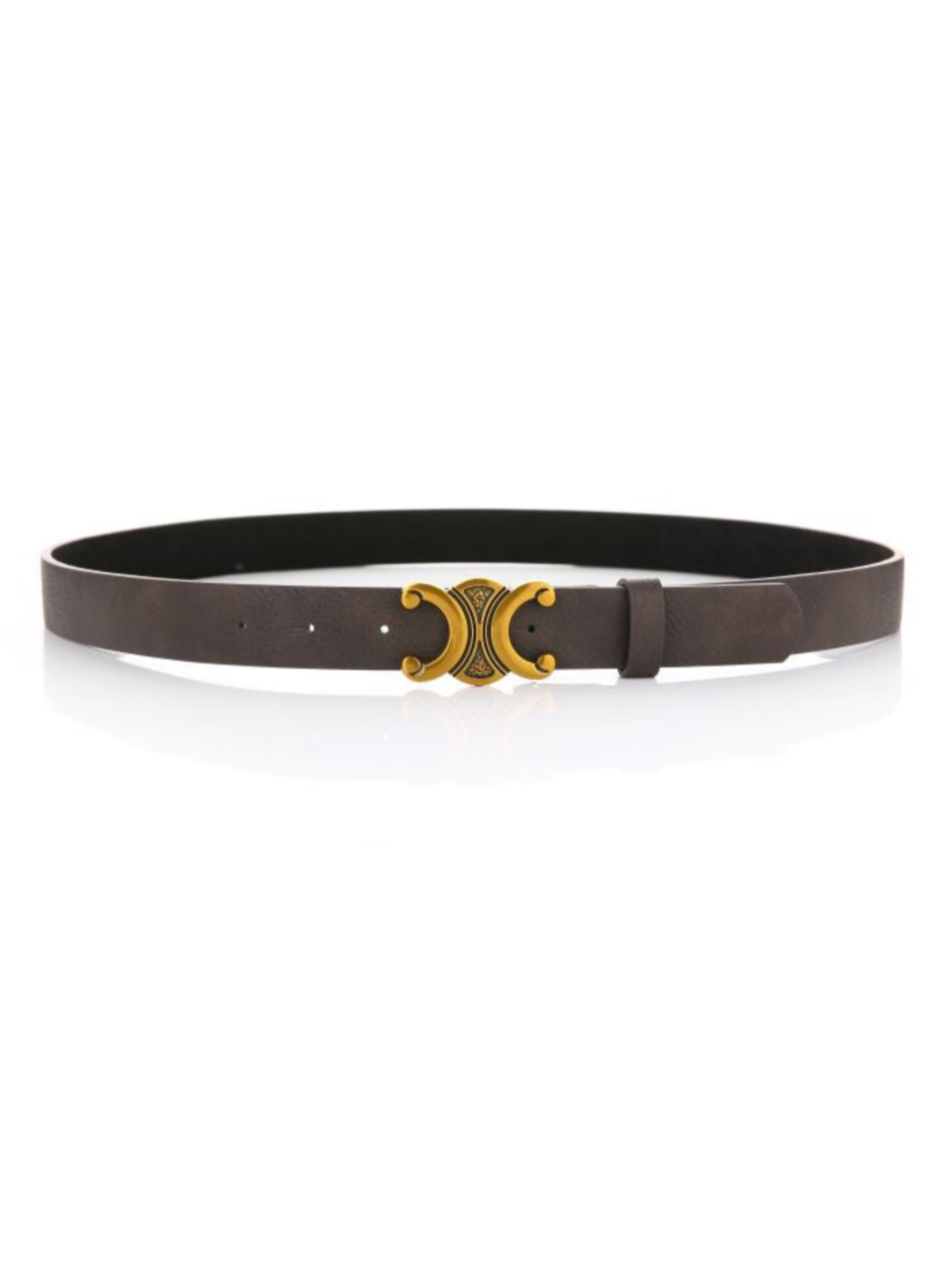 Een stijlvolle donkerbruine leren riem met een opvallende goudkleurige, decoratieve gesp in een elegant symmetrisch ontwerp. Perfect als subtiel maar chic accent bij elke outfit.✨