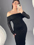 Verleidelijke off-shoulder jurk met een subtiel kanten patroon en aansluitend silhouet. De stretchstof zorgt voor een elegante look én comfort. Ideaal voor feestjes, diners of formele events.