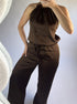 De Satin Two-Piece Set Brown combineert elegantie en comfort: een satijnen top met open rug en verstelbare striksluiting, samen met een broek met elastische tailleband voor een perfecte pasvorm. De rich bruine tint geeft je look warmte zonder te overheersen. Perfect voor zonnige dagen, een beach party of avondje uit. Jij straalt in deze set.